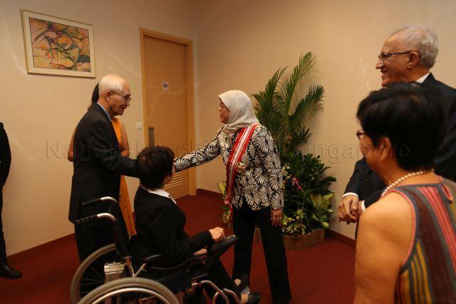 Taken at: National Day Investiture 2018 at the Institute of Technical Education (ITE) College Central Pictured: President Halimah Yacob and her husband Mr Mohamed Abdullah Alhabshee and the Public Service Star recipient, President of SPD Chia Yong Yong