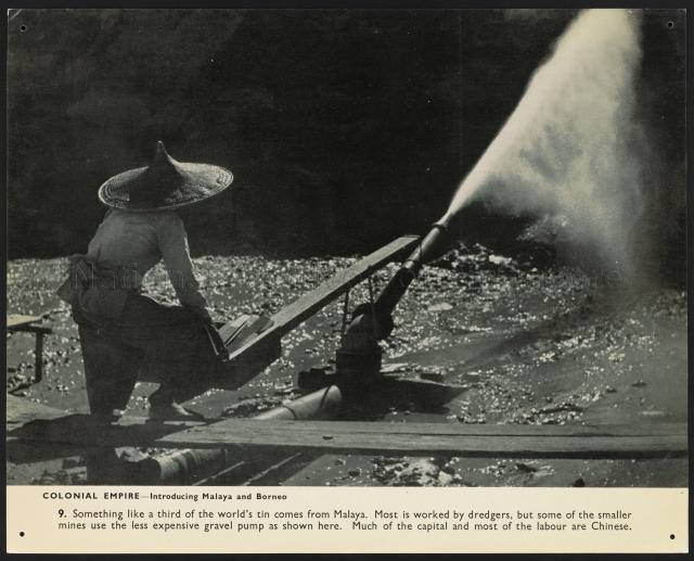 COLONIAL EMPIRE - INTRODUCING MALAYA AND BORNEO. CHINESE MAN WORKING A GRAVEL PUMP AT A TIN MINE, MALAYA. SOMETHING LIKE A THIRD OF THE WORLD'S TIN COMES FROM MALAYA. MOST IS WORKED BY DREDGERS, BUT SOME OF THE SMALLER MINES USE THE LESS EXPENSIVE GRAVEL PUMP AS SHOWN HERE. MUCH OF THE CAPITAL AND MOST OF THE LABOUR ARE CHINESE.