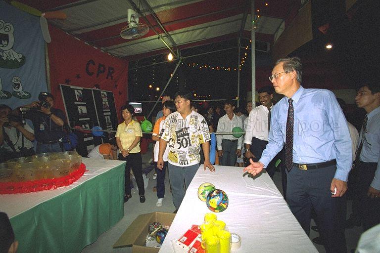 PRIME MINISTER GOH CHOK TONG TRIES HIS HAND AT A GAME WHEN HE OFFICIATES AT THE OPENING CEREMONY OF THE GEYLANG WEST COMMUNITY CLUB AT 1205 UPPER BOON KENG ROAD