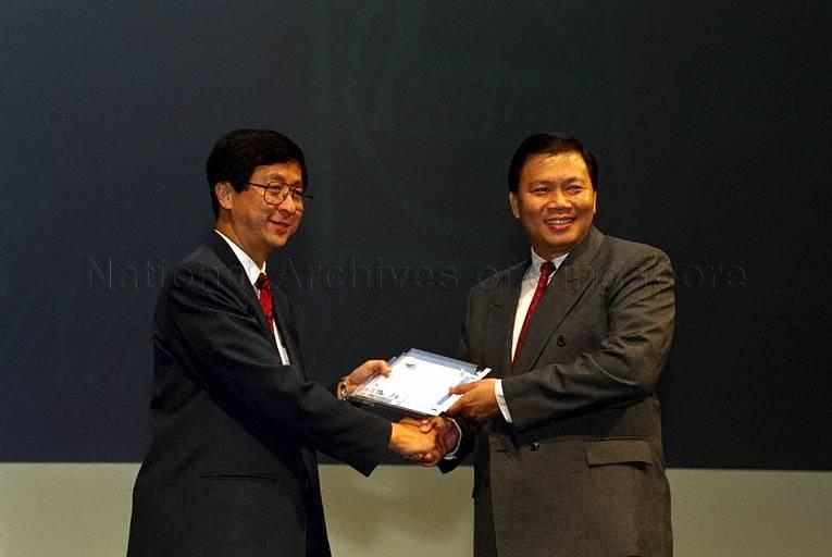 MINISTER WITHOUT PORTFOLIO LIM BOON HENG PRESENTS THE AWARD AT THE SINGAPORE QUALITY AWARD PRESENTATION AND DINNER AT THE SHANGRI-LA HOTEL ALSO ATTENDED BY PRIME MINISTER GOH CHOK TONG