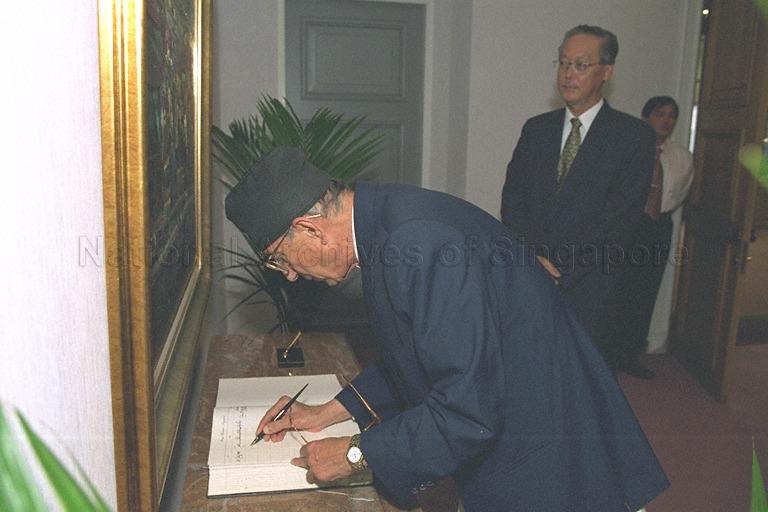 NEPAL PRIME MINISTER GIRIJA PRASAD KOIRALA SIGNING THE GUEST REGISTER WHEN HE CALLS ON PRIME MINISTER GOH CHOK TONG AT THE ISTANA