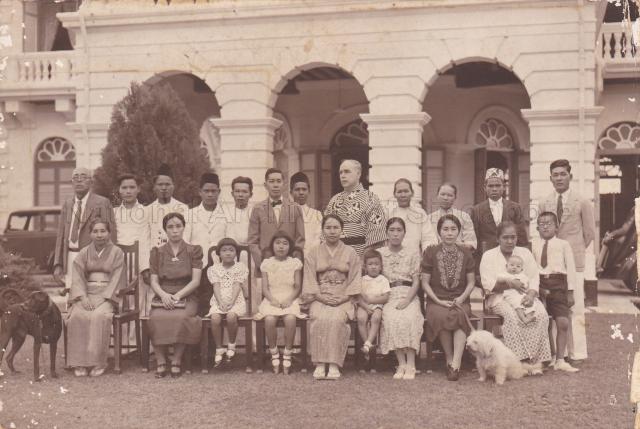 A GROUP PHOTO TAKEN AT 11 UPPER WILKIE ROAD (EMILY HILL). MIYOKO SATO (FRONT ROW 3RD FROM THE LEFT) WAS WITH HER FAMILY, FATHER DR YOSHIDA (LAST ROW 1ST FROM THE RIGHT), MOTHER HATSUE YOSHIDA (FRONT ROW 6TH FROM THE LEFT WITH A SMALL BOY WHO IS YOUNGER BROTHER OF MIYOKO), ELDEST BROTHER (FRONT ROW 1ST FROM THE RIGHT) AND MIYOKO’S MOTHER'S UNCLE DR JUKICHI IKEDA WHO OWNED THIS HOUSE (LAST ROW 6TH FROM THE LEFT). DR IKEDA’S DENTAL CLINIC WAS AT HILL STREET. FRONT ROW 3RD FROM THE RIGHT WITH A DOG IS WIFE OF DR IKEDA. THE MALAYS WERE THEIR SERVANTS. FRONT ROW 2ND FROM THE LEFT AND 4TH FROM THE LEFT WHO ARE RELATIVES VISITING SINGAPORE FROM JAPAN. MR JUKICHI IKEDA’S RELATIVE IS THE FIRST ROW 5TH FROM THE LEFT AND BEHIND IS HER AUSTRALIAN HUSBAND.