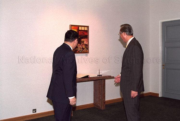 INDONESIAN ATTORNEY-GENERAL MARZUKI DARUSMAN BEING INVITED TO SIGN THE GUEST BOOK DURING HIS COURTESY CALL ON PRIME MINISTER GOH CHOK TONG