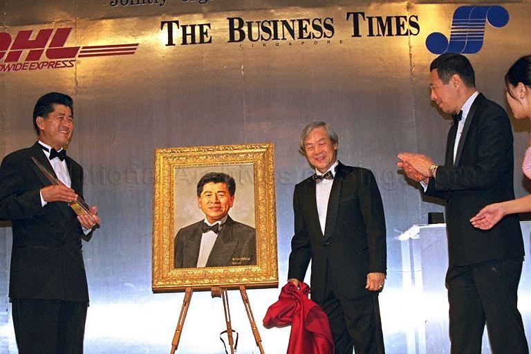 BUSINESSMAN OF THE YEAR 1999 MR TOMMIE GOH'S PORTRAIT BEING UNVEILED WITH DEPUTY PRIME MINISTER BRIGADIER-GENERAL (NS) LEE HSIEN LOONG LOOKING ON DURING SINGAPORE BUSINESS AWARD PRESENTATION CEREMONY AT RITZ CARLTON, MILLENIA SINGAPORE