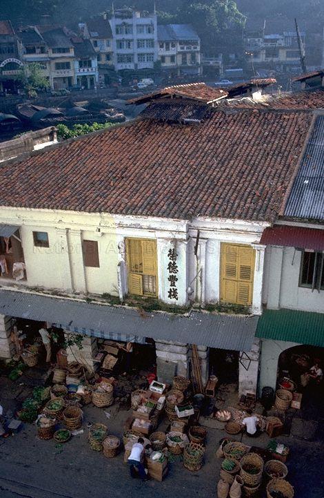 BIRD'S EYE VIEW OF SINGAPORE RIVER AND BOAT QUAY FROM ELLENBOROUGH STREET WITH MARKET ACTIVITY