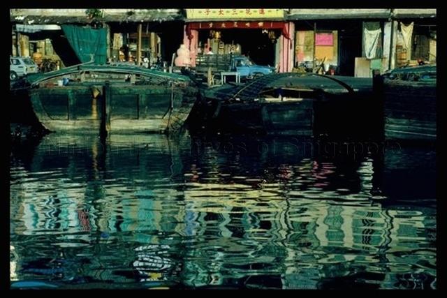 SHOPHOUSES AT CLARKE QUAY, LIANG HIANG TWA TEMPLE (WITH A RED BANNER) AND TWAKOWS REFLECTED IN THE SINGAPORE RIVER