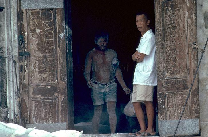 ROBERTSON QUAY GODOWN AND WORKER COVERED IN FLOUR.