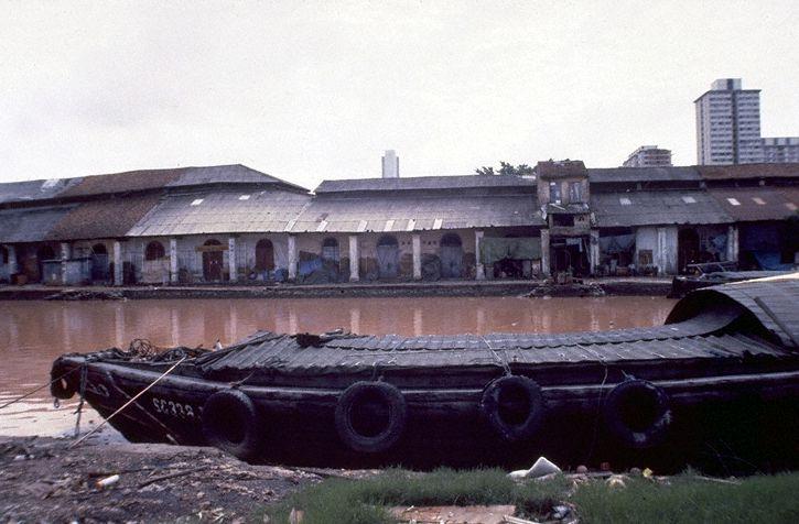AFTER HEAVY RAIN SINGAPORE RIVER TAKES ON MUDDY BROWN COLOUR AT ALKAFF QUAY LINED WITH MODEST LOOKING GODOWNS