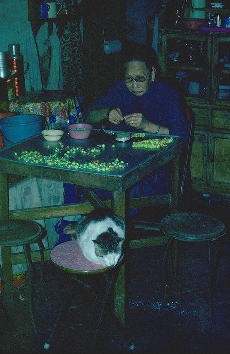 OLD LADY ROLLS COLOURED RICE FLOUR BALLS IN HER KITCHEN IN MERCHANT STREET IN PREPARATION FOR THE TANG CHEK/ DONG ZHI/ WINTER SOLSTICE FESTIVAL