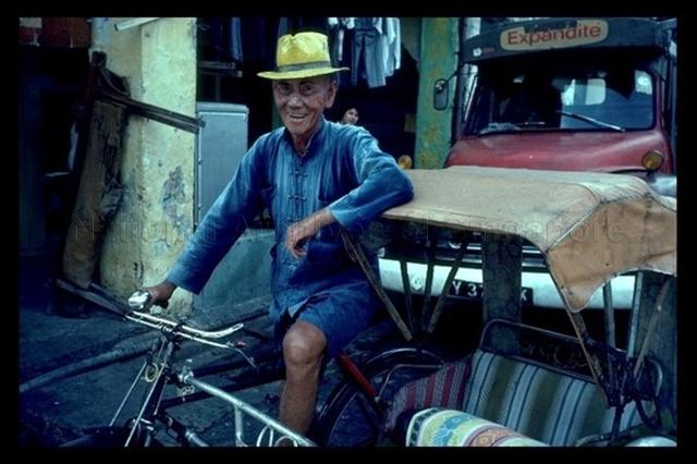 A TRISHAW RIDER DRESSED IN A PAIR OF BLUE CHINA SHORTS, A KNOTTED BUTTON JACKET AND A DAPPER STRAW HAT SITTING ON HIS TRISHAW AT TELOK AYER STREET, 1978