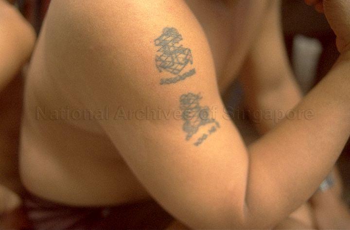 CLOSEUP OF TATTOOS ON THE ARM OF A FORMER GANG MEMBER FROM BOAT QUAY. TATTOOS ARE CROSSED OUT TO INDICATE HE IS NO LONGER A MEMBER OF SECRET SOCIETY AND CANNOT BE ARRESTED BY THE POLICE UNDER THE INTERNAL SECURITY ACT