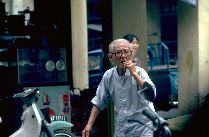 SAM FOO DRESSED OLD LADY EATS WHILE WALKING ALONG NEWBRIDGE STREET