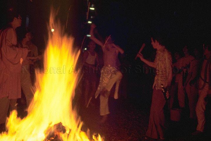 A MEDIUM IN A TRANCE DANCING AROUND THE FLAMES AT A DEITY SENDING OFF CEREMONY IN REDHILL, 1982