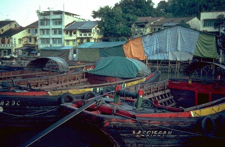 TWAKOWS PARKED AT NORTH BOAT QUAY WITH A WAYANG STAGE IN THE BACKGROUND