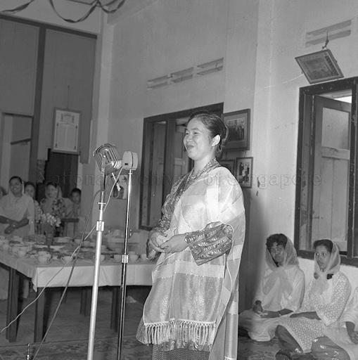 TEA PARTY OF YOUNG WOMEN MUSLIM ASSOCIATION TO CELEBRATE PROPHET MOHAMMED'S BIRTHDAY WITH TOH PUAN NOOR AISHAH, WIFE OF YANG DI-PERTUAN NEGARA OF SINGAPORE INCHE YUSOF BIN ISHAK, AS GUEST AT 31, LORONG 12