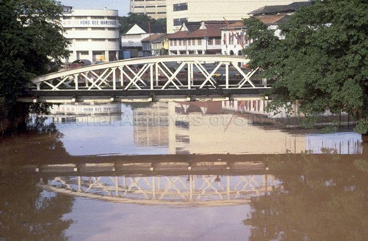 PULAU SAIGON BRIDGE, ALSO KNOWN AS BUTCHER BRIDGE, ACROSS SINGAPORE RIVER. IT WAS BUILT IN 1890, AND DEMOLISHED IN 1986 TO MAKE WAY FOR CENTRAL EXPRESSWAY.