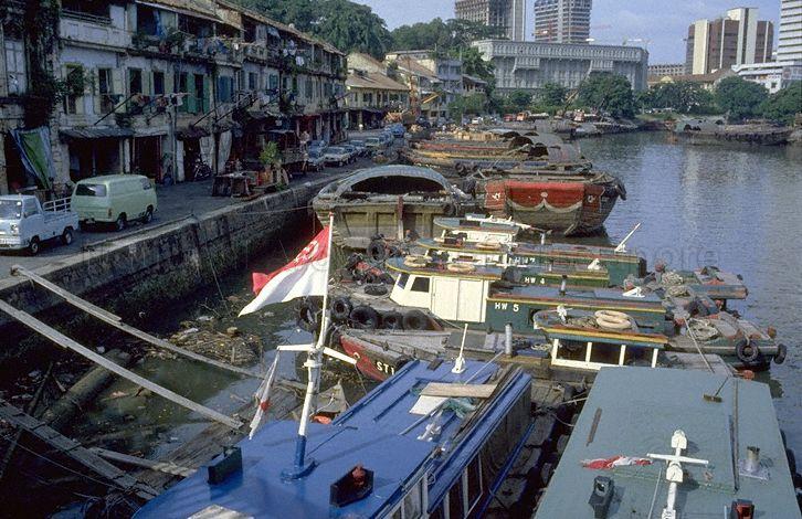 TONGKANGS AND TWAKOWS PARKED AT CLARKE QUAY DURING LOW TIDE WITH HILL STREET POLICE HEADQUARTERS IN THE BACKGROUND, 1982