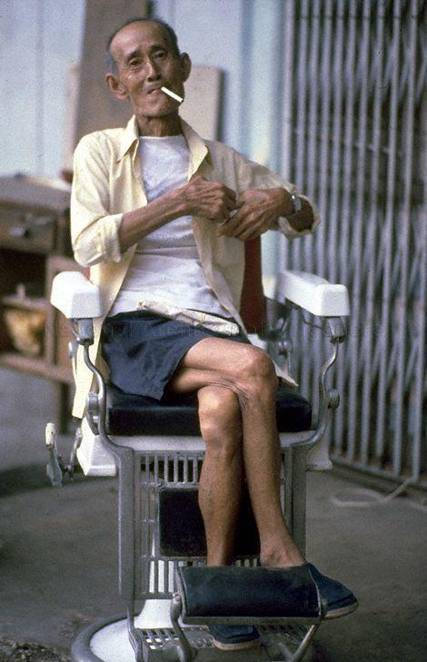 CLARKE QUAY BARBER SITS ON HIS FIVE-FOOT WAY CHAIR, TAKING A SMOKING BREAK