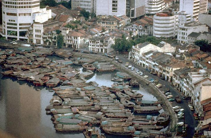 SOUTH BOAT QUAY WITH HUNDREDS OF RIVERCRAFT STILL PARKED AT THE BANKS, IN THE SHADOWS OF THE NEW MERCANTILE BUILDINGS