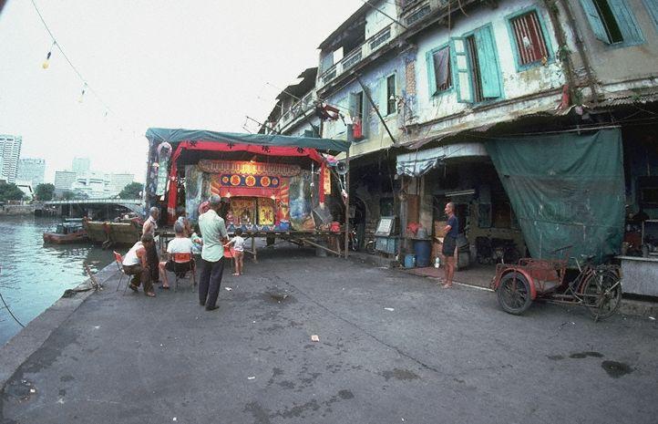 A PUPPET SHOW STAGE SET UP AT CLARKE QUAY WITH READ BRIDGE IN THE BACKGROUND, 1983