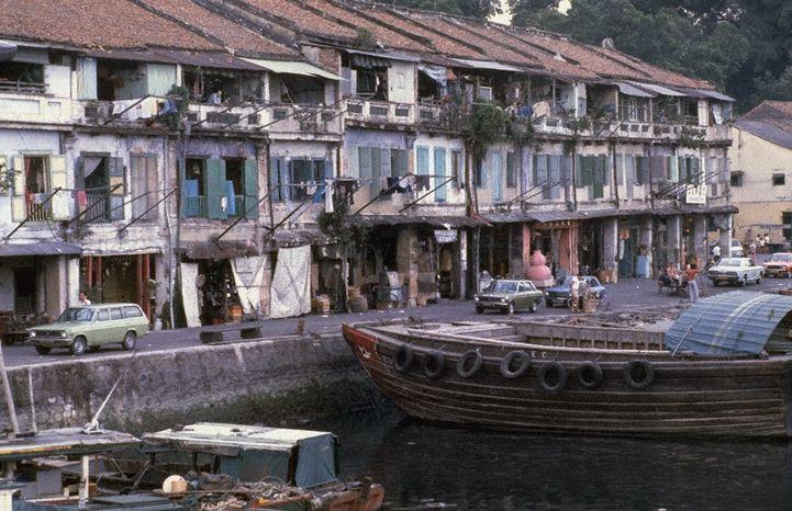 PRE-WAR SHOPHOUSES AT CLARKE QUAY WITH TWAKOWS MOORED AGAINST THE WHARF IN FRONT OF THE LIANG HIANG TWA TEMPLE
