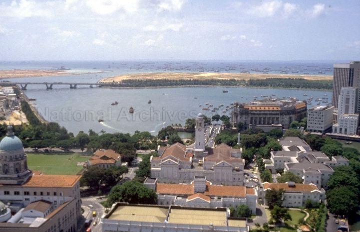 BIRD'S EYE VIEW OF BENJAMIN SHEARES BRIDGE BEING BUILT WITH THE VICTORIA THEATRE CLOCK TOWER, THE GENERAL POST OFFICE AND THE SUPREME COURT AND THE PADANG IN THE FOREGROUND