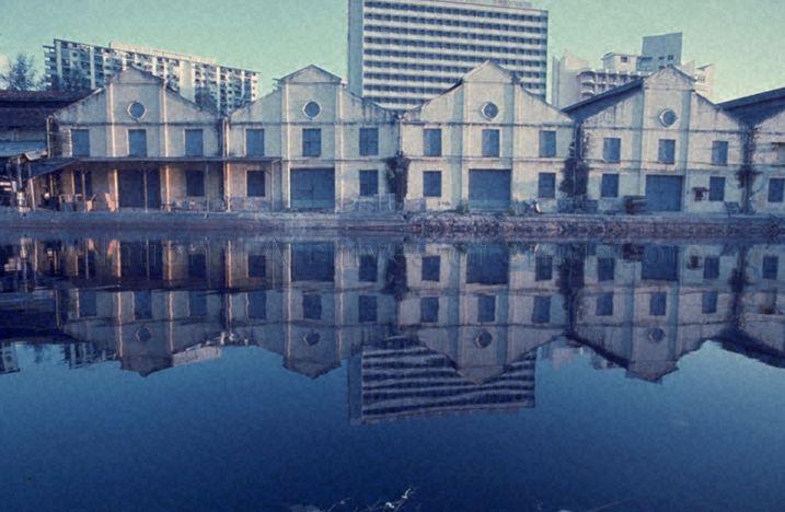 GODOWNS AND BACKGROUND HAVELOCK ROAD HOTELS REFLECT MIRROR IMAGES TO SURFACE OF SINGAPORE RIVER