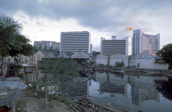ROBERTSON QUAY GODOWNS AND HAVELOCK ROAD HOTELS IN THE BACKGROUND REFLECTED IN THE SINGAPORE RIVER