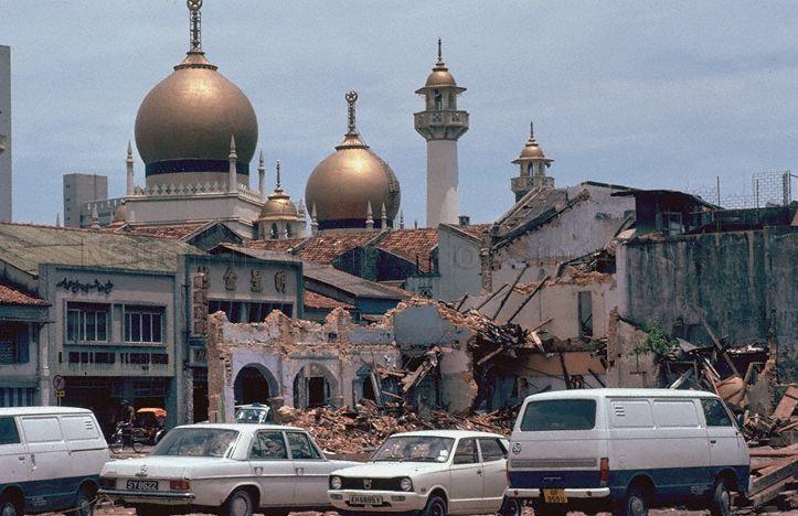 DEMOLITION OF SHOPHOUSES ALONG ARAB STREET WITH THE MOSQUE MINARETS VISIBLE THROUGH THE BUILDING DEBRIS