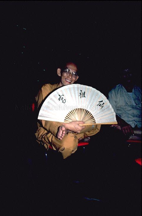 TAOIST PRIEST WITH INK INSCRIBED FAN POSES AT A FUNERAL WAKE