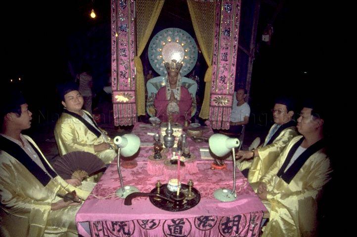 TAOIST PRIEST WITH CROWN AND THRONE WITH YELLOW ROBED ASSISTANTS, SUPERVISING FUNERAL RITUALS AT A WAKE. VARIOUS RELIGIOUS TOOLS CAN BE SEEN ON THE TABLE INCLUDING A RAM'S HORN