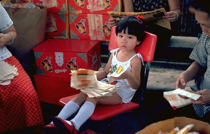 YOUNG GIRL WITH KIM CHUA/ JOSS PAPERS AT KAMPONG SAM TENG TAOIST CEREMONY