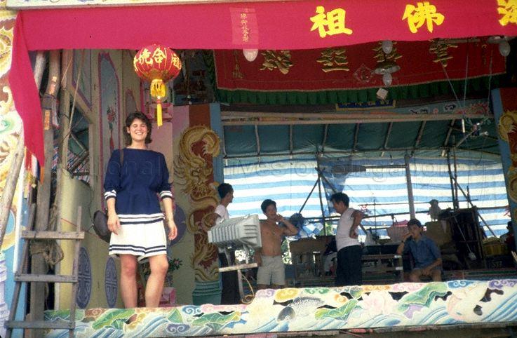 VISITOR ANTONIA NAGEL ON A WAYANG STAGE WITHOUT THE BACKDROP, EXPOSING THE BACKSTAGE