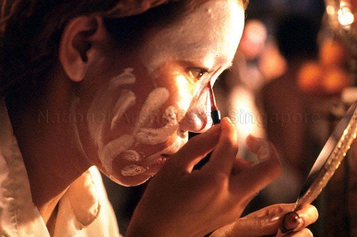 BACKSTAGE - CLOSE-UP OF KA TEK RENOWNED TEOCHEW OPERA STAR APPLYING EYE LINER AND MAKEUP