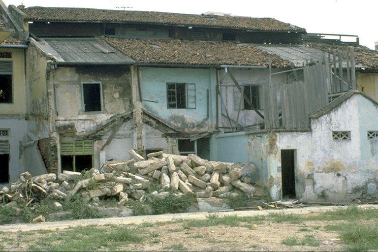 DEMOLITION OF SHOPHOUSES AT SYED ALWI ROAD, OFF JALAN BESAR. SYED ALWI ROAD WAS NAMED AFTER SYED SYED ALWI ALJUNIED, A YEMENI ARAB TRADER WHO CAME TO SINGAPORE FROM SUMATRA AND LIVED IN THE LATE 19TH CENTURY. HE OWNED SEVERAL LOTS OF LAND IN THAT AREA.