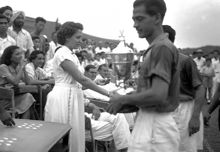 [SINGAPORE RECREATION CLUB "REDS" RETAINED THE SINGAPORE HOCKEY ASSOCIATION KNOCK-OUT TROPHY WHEN THEY BEAT SINGAPORE CRICKET CLUB TWO-NIL IN THE FINAL ON THE PADANG YESTERDAY.] MRS G E N OEHLERS, WIFE OF THE SINGAPORE HOCKEY ASSOCIATION PRESIDENT, GIVES AWAY THE K O TROPHY TO NEUBRONNER, CAPTAIN OF THE WINNERS, SINGAPORE RECREATION CLUB.