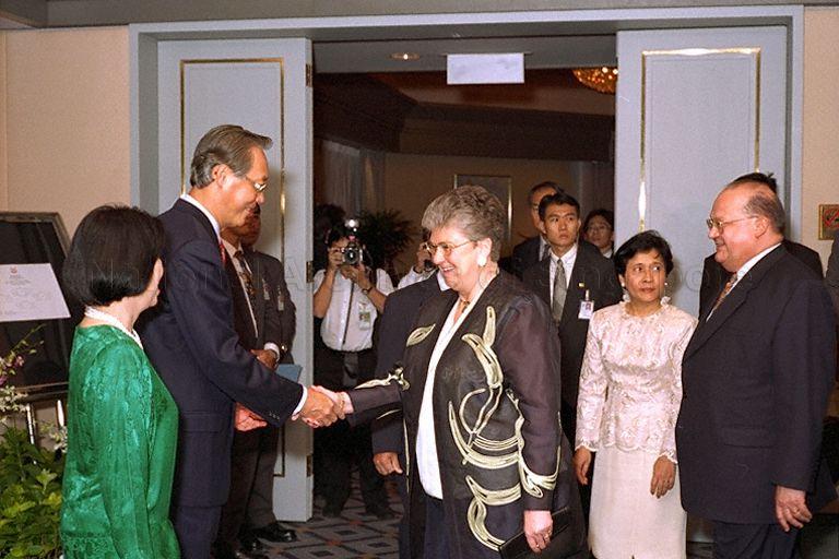 PRIME MINISTER GOH CHOK TONG WELCOMING MRS CELIA DEHAENE, THE WIFE OF THE PRIME MINSTER OF BELGIUM JEAN-LUC TO DINNER AT THE COMPASS ROSE, WESTIN STAMFORD HOTEL HOSTED BY THE HIM AND HIS WIFE