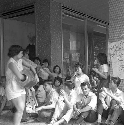 [THE STRIKE AT ROBINSON'S - WHICH LED TO THE ARREST OF 216 PICKETS FOR OBSTRUCTION - WAS CALLED OFF TODAY AFTER ANOTHER ROUND OF TALKS BETWEEN THE MANAGEMENT AND THE SINGAPORE BUSINESS HOUSES EMPLOYEES UNION.] STRIKING EMPLOYEES OF ROBINSON'S DEPARTMENT STORE IN RAFFLES PLACE HAND OUT BISCUITS AND DRINKS TO THEIR COLLEAGUES YESTERDAY MORNING BEFORE IT WAS ANNOUNCED THAT THE STRIKE HAD BEEN SETTLED.