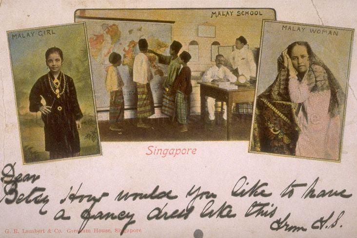 POSTCARD SHOWING FROM LEFT A MALAY GIRL, MALAY SCHOOL AND A MALAY WOMAN, SINGAPORE