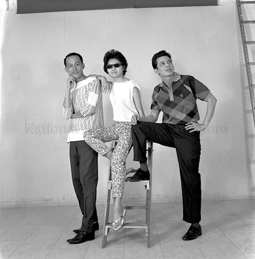 [(L-R) MIKE BOON, RITA CHANG, TERRENCE DE SOUZA] CUTTING A DASH ON THE BEACH WITH (FROM LEFT) MIKE BOON, RITA CHANG AND TERRENCE DE SOUZA. MIKE WEARS A 3/4-LENGTH SWEATER OF RED AND BROWN PEPPERMINT STRIPES. THE WHITE SQUARE YOKE AND HEM COMPLEMENTS THE POCKET ON THE LEFT SLEEVE. PRICE: $12.50. RITA WEARS A PLEATED LACE BLOUSE IN FRAGILE PINK TETORON TEAMED WITH STRETCHABLE BAN-ION SLACKS IN MUTED SHADER OF RED AND RASPBERRY PINK. BLOUSE: $12, SLACKS: $15. TERRENCE IS SEEN IN A MULTI-COLOURED SWEATER THAT IS BRIGHT AS A PEACOCK'S FAN-TAIL IN RED, CRIMSON, BLUE AND BLACK DIAGONAL CHECKS. PRICE: $17.50.