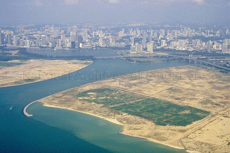 A VIEW OF MARINA EAST, MARINA SOUTH, MARINA BAY, BENJAMIN SHEARES BRIDGE/EAST COAST PARKWAY (ECP) AND BUILDINGS ALONG THE WATERFRONT. (LATE 1980S)