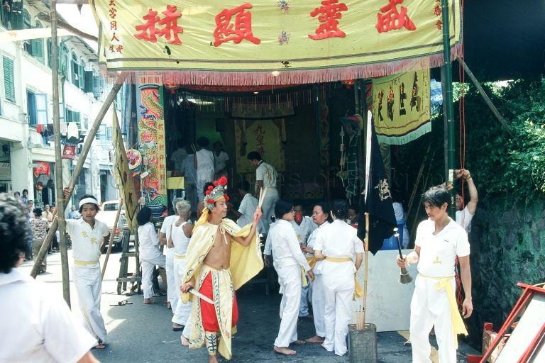 THE DEITY "XUAN TIAN SHANG DI", PERSONIFIED BY A MEDIUM, EXAMINES AN ALTAR SET UP ON THE STREET AT KIM YAM ROAD AT THE START OF A NINE EMPEROR GODS PROCESSION
