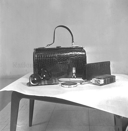 [AN IMITATION CROCODILE SKIN BAG. MADE IN HONGKONG, THIS BAG IS BIG ENOUGH, PRACTICAL AND UP TO DATE TO LUG AROUND THE DALLY 'MUSTS'. WHAT GOES INTO THE BAG AS SEEN HERE: A SET OF TARTAN BLACK AND RED SPECTACLE CASE, COMPACT AND CIGARETTE CASE. THE SET IS FROM GERMANY AND COSTS $4.90, $9.70 AND $3.85 RESPECTIVELY. ON THE RIGHT IS A PURE LIZARD SKIN WALLET CASE. HANDSOME FOR WOMEN AS WELL AS FOR MEN. THE INSIDE OF THE WALLET HAS SECTIONS FOR BILLS (DOLLARS, NOTE-BOOKS, CALLING CARDS, IDENTITY CARD AND DRIVER'S LICENSE. COSTS $15. CUTE DAISY PERFUME CONTAINER FROM FRANCE AT $6.60. THERE ARE A NUMBER OF STYLES TO CHOOSE FROM.] HEADLINE: [YOU CAN TELL A WOMAN BY HER HANDBAG!]