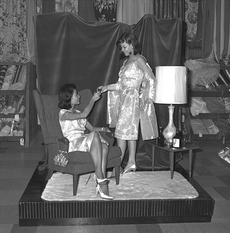 [(L-R) VICKY, ALICE] THE "MY FAIR LADY" LOOK - AN EVOCATION OF DEMURE DAINTINESS. IT'S A YOUNG, ROMANTIC MOOD TO UNLEASH ALL THE DORMANT CHIVALRY IN THE MALE. TO MAKE HIM WANT TO STAY BY YOUR SIDE IN RAPT ATTENTION.