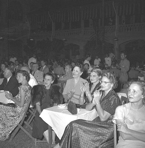 [BATHING SUIT PARADE AT RAFFLES HOTEL, SINGAPORE. FIVE HUNDRED FASHION-CONSCIOUS SINGAPOREANS CROWDED INTO RAFFLES PALM COURT ON TUESDAY NIGHT FOR A 90-MINUTE PREVIEW OF AMERICA'S BEACHWEAR FOR AUTUMN THIS YEAR. FORTY-FOUR SWIMSUITS, PLAYSUITS AND SUNFROCKS OF DAZZLING DESIGNS FROM A COLLECTION OF 150 WHICH MR RAY SCOTT, AUSTRALIAN REPRESENTATIVE OF AN AMERICAN FIRM BROUGHT TO SINGAPORE, WERE DISPLAYED.] EXTRACT FR TEXT: [EXPRESSIONS CAUGHT BY THE CAMERA AS IT ROVED THE TABLES. THE LADY (CENTRE) COULD BE DISAPPROVING ABOUT BOTH SWIM SUITS AND BATHING BEAUTIES.]