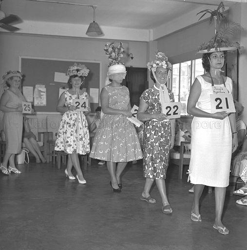 EASTER PARADE ON LADIES HATS FASHION AT MAJEDEE BARRACKS NAAFI CANTEEN IN JOHORE BY THE WIVES CLUB.