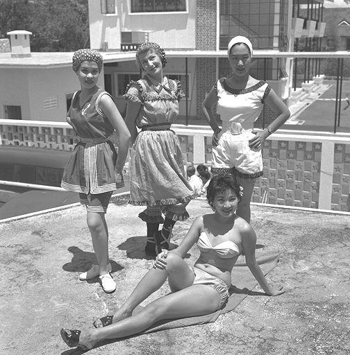 [SINGAPORE BEAUTIES STAGED A PARADE OF BEACHWEAR OVER THE PAST 77 YEARS AT THE ALL-DAY PICNIC SPONSORED BY THE SINGAPORE PROFESSIONAL WOMEN'S ASSOCIATION AT THE SHAW'S HOLIDAY BUNGALOW IN EAST COAST ROAD.] A SAMPLE OF MODELS - IS SHOWN IN THIS STRAITS TIMES PICTURE: FROM LEFT ARE LEONIE CLUNIES - ROSS, IN THE STYLE OF 1916, LISA LOCKE AS MISS 1901, ROSALIND YANG AS MISS 1929 AND DAISY SZETO AS MISS 1957.