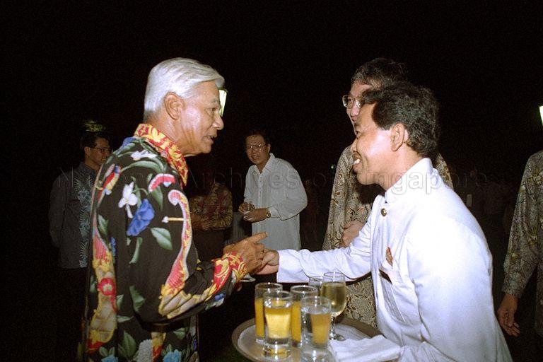 MALAYSIA UNIVERSITY SAINS PRO-CHANCELLOR RAJA TUN ASLAN MUHIBUDDIN SHAH ATTENDING A DINNER HOSTED BY PRESIDENT ONG TENG CHEONG AND MRS ONG FOR THE NATIONAL UNIVERSITY OF SINGAPORE (NUS) - THE MALAYAN UNIVERSITY (MU) GOLF TEAM AND THEIR SPOUSES AT THE ISTANA