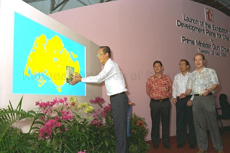PRIME MINISTER GOH CHOK TONG PASTING A FOLDER OF A BUILDING ON THE LOCATION OF CHAI CHEE ON THE MAP OF SINGAPORE WHILE THE SPEAKER TAN SOO KHOON AND OTHERS LOOK ON AT THE LAUNCH OF THE EXHIBITION ON DEVELOPMENT PLANS FOR CHAI CHEE