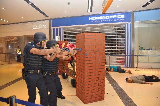 EXERCISE HEARTBEAT 2014 - POLICE OFFICERS RUSHING IN TO TAKE DOWN "GUNMEN" AFTER THEY FIRED AT "SHOPPERS" IN MARINA BAY LINK MALL